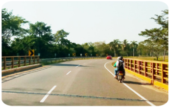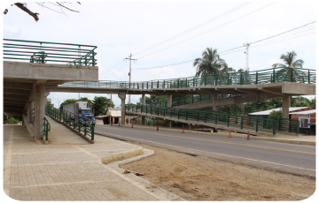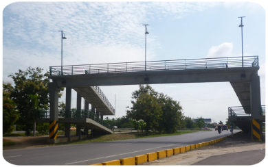 Es un puente en concreto reforzado con barandas metálicas, (2) paraderos para buses con bahías de entrada y salida, 2 rampas laterales de acceso e iluminación.